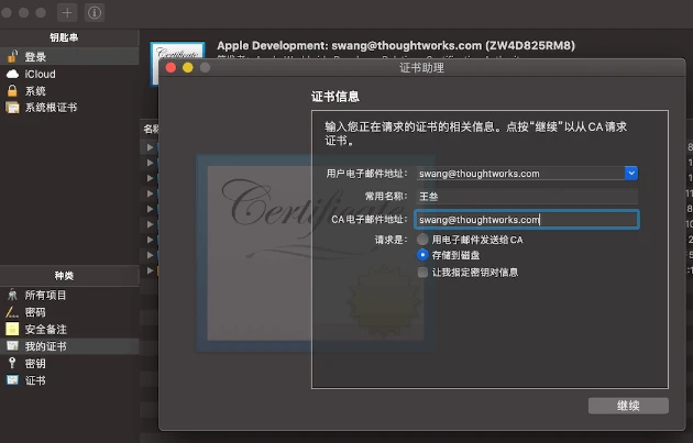 安装证书成功的情况下证书下都会生成Keychain,上面提到的证书副本(导出证书重新命名)就是通过配置证书的电脑导出Keychain(就是.p12文件)安装到其他机子上,让其他机子得到证书对应的权限。Developer Certification就可以制做副本Keychain分发到其他电脑上安装,使其可以进行真机测试。
