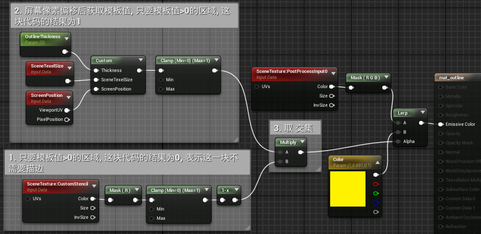 最后只有交集的地方才是值才是1, 也就是描边的区域. lerp 函数 0 的地方就是 原颜色, 1 的地方就是 描边颜色